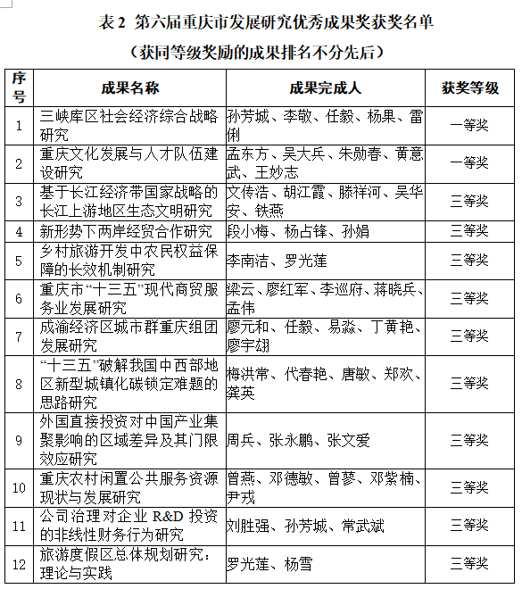 我校组织申报的12项成果获得重庆市发展研究奖,其中,一等奖2项(居全市高校第一),三等奖10项,获奖总数位居市属高校第一位。