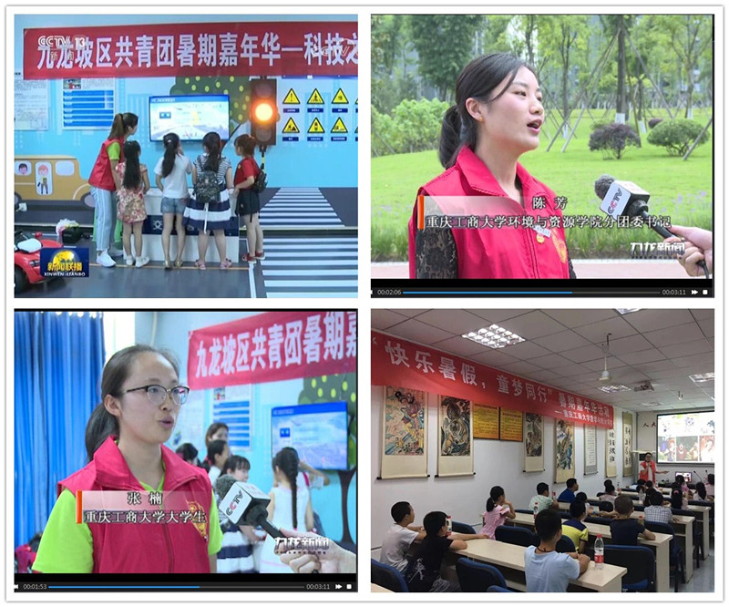 活动伊始,大家共同观看了央视新闻联播和九龙新闻,新闻报道了我校团委与九龙坡团区委合作开展了两年的“暑期嘉年华”社会实践项目情况和效果。自2016年以来,我校累计组织617名志愿者,深入45个市民学校开展暑期课堂,授课的内容涉及了科技、文化、历史、法律、管理、体育、环保等领域,培训城乡市民学校青少年和群众3803余人,累计开课1540个课时,折合1090小时,开展志愿者服务活动195次。该项目曾在2016年团中央学校部、人民网、中国青年报联合开展的全国大中专学生社会实践“千校千项”遴选活动中获得“最具影响好项目奖”。活动效果良好,得到城乡居民和社区干部的一致好评,也得到了众多媒体的报道和关注。